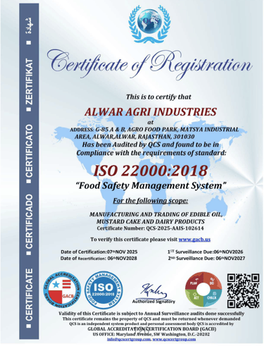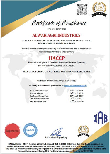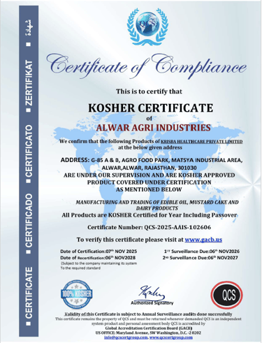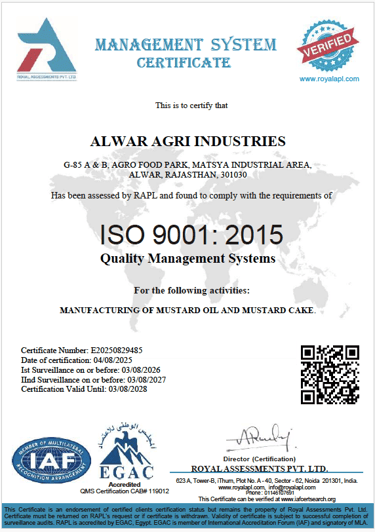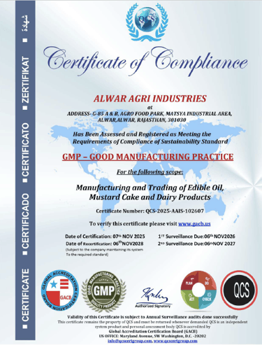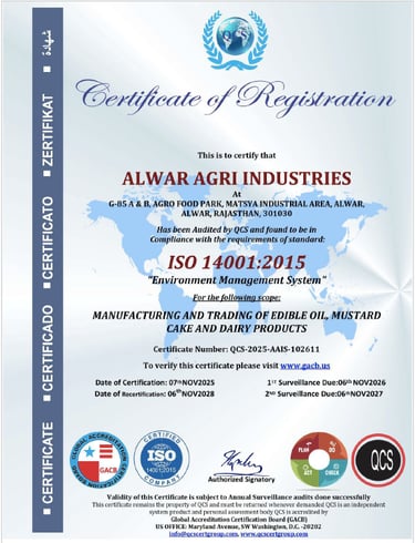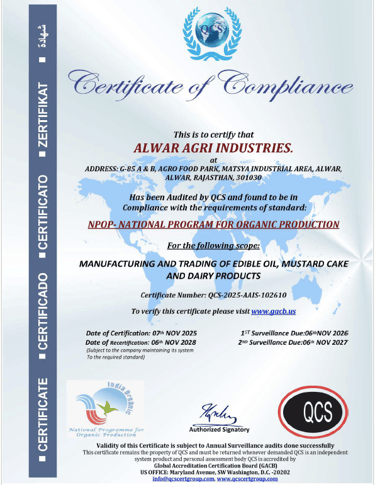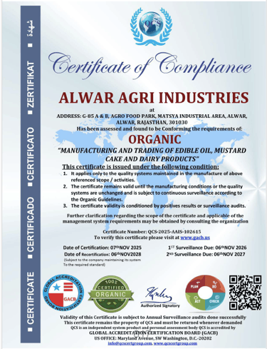 At Alwar Agri Industries, quality is not just a promise—it's our foundation. Every product we create follows strict standards to ensure purity, safety, and consistency. Our certifications reflect our commitment to excellence and our responsibility towards the customers we serve.